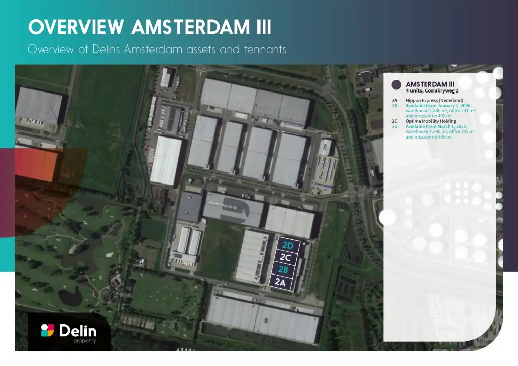 Delin Amsterdam III is situated on business park ‘Atlaspark’ part of the Port of Amsterdam area. Atlaspark is designated for large scale logistics companies offering multimodal connection possibilities via sea, air, rail, and road. As such the location is ideally located for both national and international distribution.